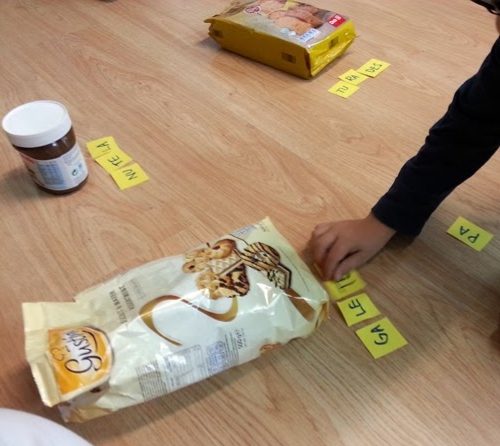 Hem de pensar el nom de cada producte (que hem triat i tenim davant), comptar els cops de veu del producte (que equival a fragmentar la paraula en síl.labes).